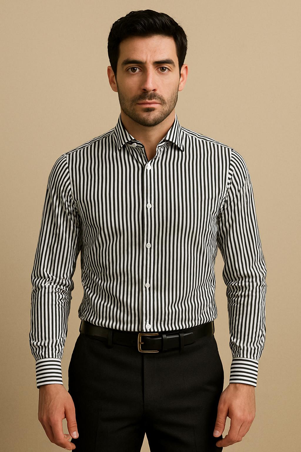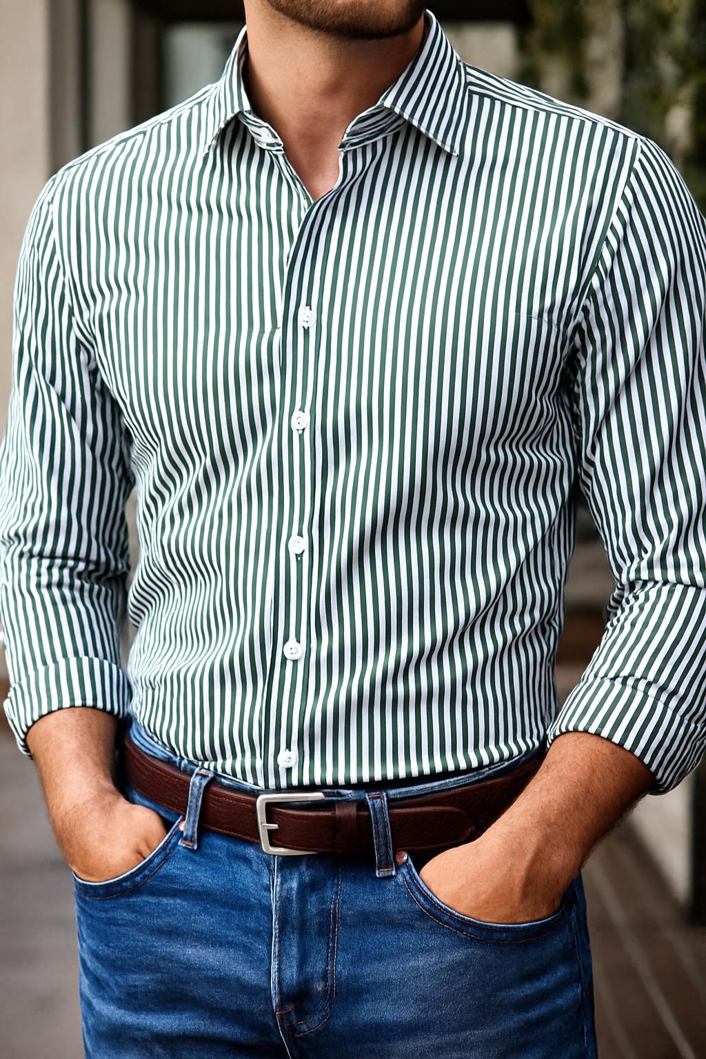 Un classico intramontabile che aggiunge subito struttura e personalità all’outfit, senza risultare eccessive. Le righe verticali slanciano visivamente la figura, facendo apparire chi le indossa più alto e più asciutto, quindi sono ideali anche per chi cerca un effetto ottico più armonioso. Una camicia rigata bianca e azzurra o bianca e blu è considerata un “must-have” del guardaroba perché si abbina facilmente sia a look formali che casual